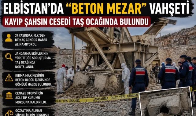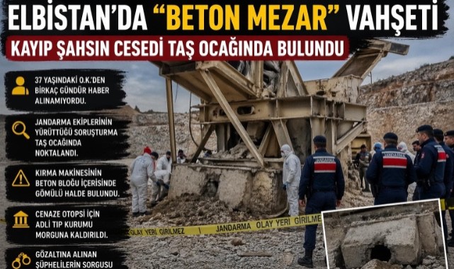 Edinilen bilgilere göre, Afşin nüfusuna kayıtlı O.K.’den bir süredir haber alınamaması üzerine başlatılan arama çalışmaları, Elbistan İlçe Jandarma Komutanlığı ekiplerinin titiz takibiyle cinayet şüphesi üzerine yoğunlaştı. Gözaltına alınan şüphelilerin ifadeleri doğrultusunda Kışla Mahallesi mevkiinde bulunan bir taş ocağına operasyon düzenlendi.