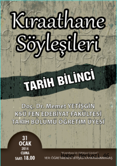 Öğretmenevi yanındaki nostaljik mekan Kıraathanede kültür-sanat aktiviteleri hız kesmeden devam ediyor. Eğitimci araştırmacı Yazar Duran Boz’un öncülüğünde yürütülen faaliyetler her Cuma saat,6.00 da başlamaktadır. Her hafta ayrı, yeni, farklı bir konunun konuşulduğu, tartışıldığı, mümtaz şahsiyetlerin konuk olduğu, ağırlandığı bu mekan K.Maraş için hareketli kültür mekanlarından biri olmaya devam ediyor. Bu haftanın konuğu KSÜ Fen Edebiyat Fakültesi Tarih Bölümü öğretim üyesi Doç. Dr. Memet YETİŞGİN, “TARİH BİLİNCİ” başlıklı bir söyleşi gerçekleştirecektir. (Tarih:31 Ocak 2014 Cuma günü Saat: 18:00)