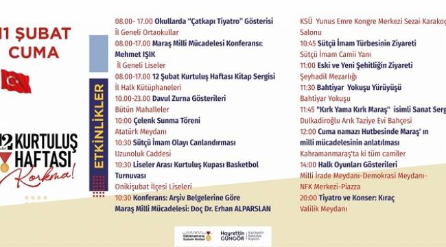 Kahramanmaraş Büyükşehir Belediyesi tarafından düzenlenen 12 Şubat Kurtuluş Haftası etkinlikleri tüm hızıyla devam ediyor. Söyleşiden konferansa, tiyatro gösterimlerinden sergilere kadar birçok alanda gerçekleştirilen etkinlikler kapsamında 11 Şubat Cuma günü kıraç konseri düzenleniyor.