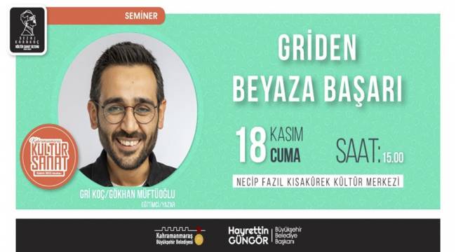 Kahramanmaraş Büyükşehir Belediyesi, sezai karakoç kültür sanat sezonu kapsamında çeşitli etkinlikleri vatandaşlarla buluşturmaya devam ediyor. Kasım ayı etkinlikleri kapsamında; konferansları, yayınları ve kitaplarıyla sadece sınav dönemindeki gençlerin değil her yaştan insanın büyük bir beğeniyle takip ettiği Gri Koç olarak bilinen Eğitimci – Yazar Gökhan Müftüoğlu, 18 Kasım Cuma günü Necip Fazıl Kısakürek Kültür Merkezi’nde öğrencilerle bir araya gelecek. ‘Griden Beyaza Başarı’ konulu seminer saat 15.00’da başlayacak. Büyükşehir Belediyesi’nden yapılan açıklamada, etkinliğe sınav dönemindeki öğrenciler başta olmak üzere tüm gençler davet edildi.