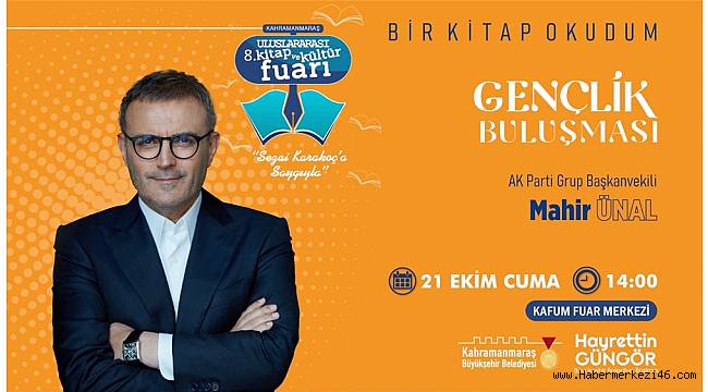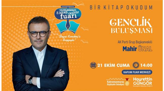 8. Uluslararası Kitap ve Kültür Fuarı kapsamında 21 Ekim Cuma günü KAFUM’da gerçekleştirilecek diğer bir etkinlikte ise AK Parti Grup Başkanvekili Mahir Ünal, okurlarla bir araya gelecek. Grup Başkanvekili Ünal, saat 14.00’da gerçekleştirilecek “Bir Kitap Okudum” temalı gençlik buluşmasında ve saat 15.00’da düzenlenecek “Yerelden Evrensele Şehir Ufku: Kahramanmaraş Örneği” başlıklı konferansta Kahramanmaraşlılara seslenecek. Büyükşehir Belediyesi’nden yapılan açıklamada etkinliklere tüm gençlerin davetli olduğu belirtildi.