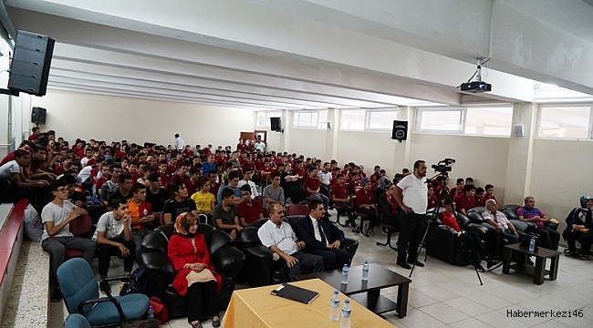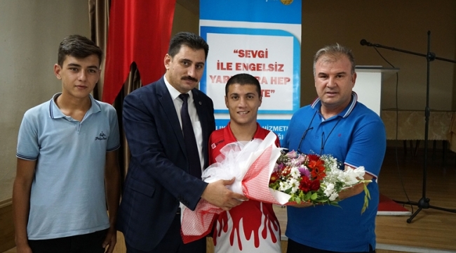 Şehit İdari Ataşe Galip Özmen Mesleki ve Teknik Anadolu Lisesi’nde gerçekleştirilen söyleşi programında Milli Yüzücü Beytullah Eroğlu çiçekle karşılandı.