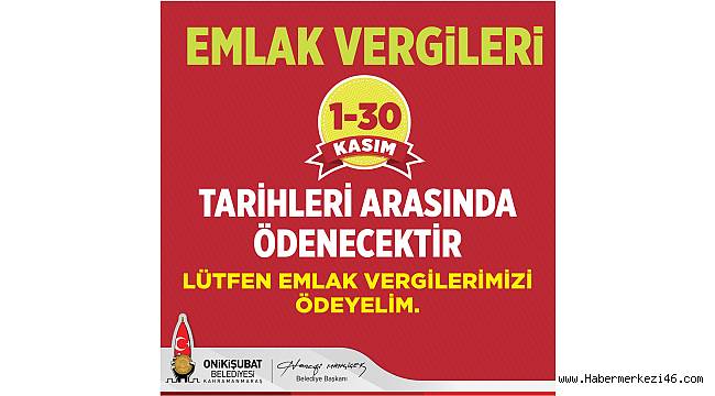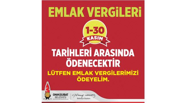 Her yıl Mayıs ve Kasım aylarında ödenen emlak vergisine ait taksit ödemelerine ilişkin bilgilendirmede bulunan Onikişubat Belediyesi, ikinci taksit ödemelerinde son günün 30 Kasım olduğunu belirterek, vatandaşlara geç kalınmaması yönünde uyarılarda bulundu. Açıklamada, belediye hizmetlerinin daha etkin, daha verimli ve daha kaliteli bir şekilde halkın hizmetine sunulması noktasında vergi ödemelerinin önemine dikkat çekildi. Ödenen vergilerin vatandaşa ve Onikişubat ilçesine hizmet olarak geri döndüğüne vurgu yapılan açıklamada, “Sevgili Onikişubat’lı kardeşlerim. Sizlere daha etkin, daha verimli ve daha kaliteli hizmet sunabilmemiz için vergilerinizi ödemeyi unutmamamız rica olunur. Yatırdığınız vergilerin her kuruşu, hizmet olarak Onikişubat’a geri dönüyor” denildi.