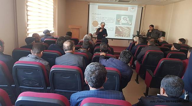 İlce Müdürlüğü toplantı salonunda organik tarım ve iyi tarım uygulamaları konusunda ilce Müdürü Cemal Karasakal ve konu sorumlusu teknik personel tarafından çiftçilerle bilgilendirme toplantısı yapıldı.