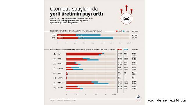 Türkiye otomotiv pazarında geçen yıl toplam satışlarda yerli üretim araçların payı 2018'e kıyasla yaklaşık 6 puanlık artışla yüzde 43'e yükseldi.