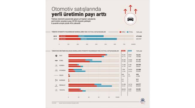 Yerli üretim araçların toplam satıştaki payı 2018'de yüzde 37,1 iken, bu oran geçen yıl yüzde 43'e yükseldi. Bu dönemde ithal otomobillerin toplam satıştaki payı yüzde 63'ten yüzde 57'ye geriledi.