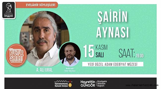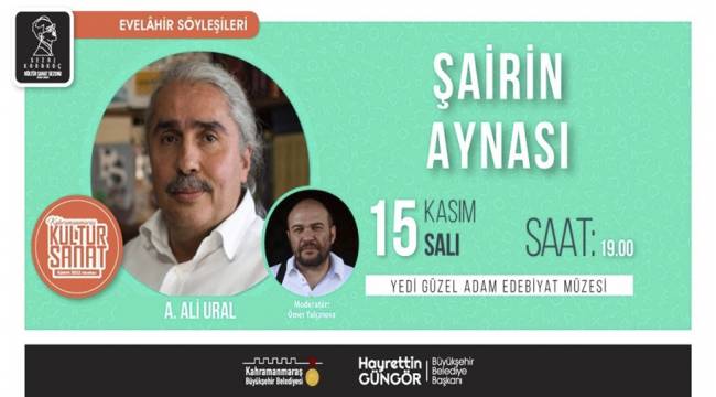 Kahramanmaraş Büyükşehir Belediyesi, Kasım Kültür Sanat Etkinlikleri kapsamında çeşitli programları edebiyatseverlerle buluşturmaya devam ediyor. Etkinlik takvimi kapsamında 15 Kasım Salı günü ‘Şairin Aynası’ konulu Evelâhir Söyleşileri gerçekleştirilecek.