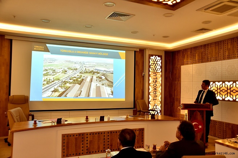 Türkoğlu Belediyesinde düzenlenen toplantıda, Belediye Başkanı Osman Okumuş sunumlarla sanayileşen Türkoğlu hakkında bilgiler verdi.