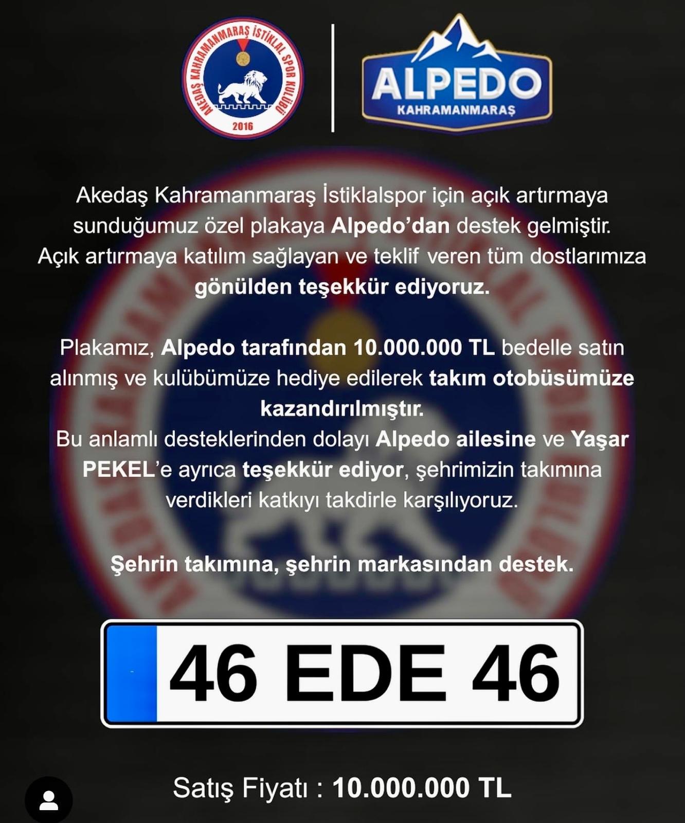 Kulüp tarafından gelir elde etmek amacıyla açık artırmaya sunulan "46 EDE 46" özel plakası, Alpedo tarafından rekor bir bedelle satın alındı.