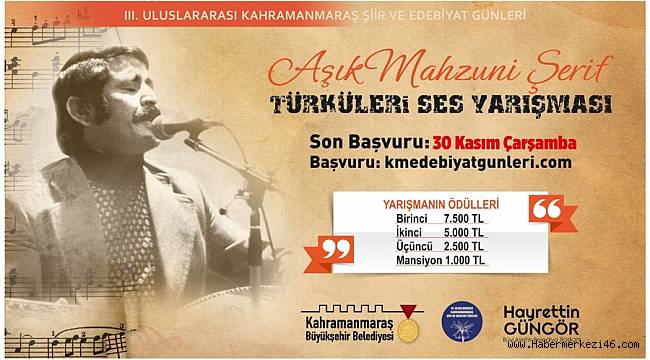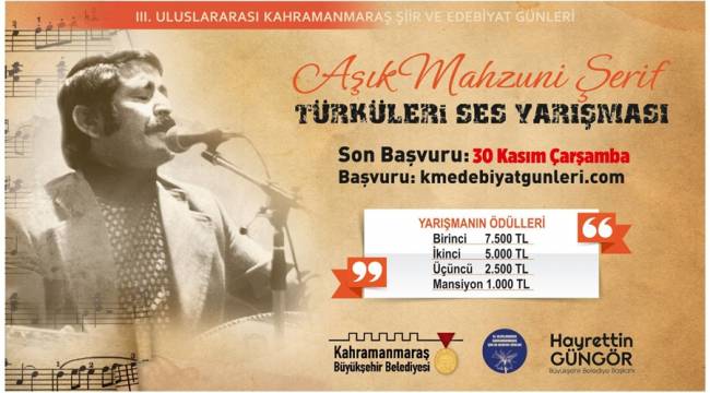 Kahramanmaraş Büyükşehir Belediyesi tarafından bu yıl 3’üncüsü gerçekleştirilecek Uluslararası Kahramanmaraş Şiir ve Edebiyat Günleri kapsamında düzenlenecek Âşık Mahzuni Şerif Türküleri Ses Yarışması’nın başvuru süresi uzatıldı. Büyükşehir Belediyesi’nin internet sitesi üzerinden çevrimiçi olarak yapılabilen başvurularda son gün 30 Kasım Çarşamba.