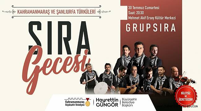 Kahramanmaraş Büyükşehir Belediyesi, kültür sanat etkinliklerini aralıksız sürdürüyor. Bu kapsamda, 30 Temmuz Cumartesi günü ‘Sıra Gecesi’ programı gerçekleştirilecek. Mehmet Akif Ersoy Kültür Merkezi’nde düzenlenecek etkinlik saat 20.30’da başlayacak.