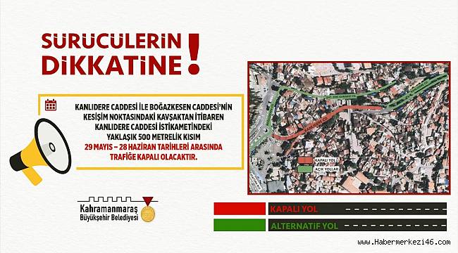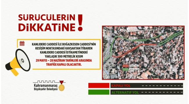 Bu kapsamda alınan UKOME kararı doğrultusunda Kanlıdere Caddesi ile Boğazkesen Caddesi’nin kesişim noktasındaki kavşaktan itibaren Kanlıdere Caddesi istikametindeki yaklaşık 500 metrelik kısım 29 Mayıs – 28 Haziran tarihleri arasında trafiğe kapalı olacaktır.