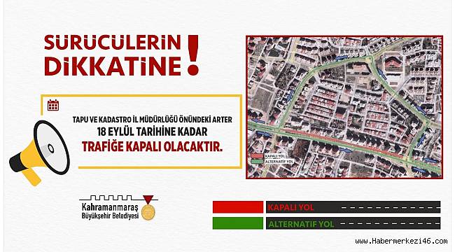 Tapu ve Kadastro İl Müdürlüğü önünde süren çalışmalar dolayısıyla, UKOME kararı doğrultusunda arterin bir bölümünün 18 Eylül Pazar gününe kadar trafiğe kapalı olacağı duyuruldu.