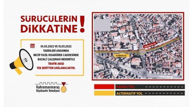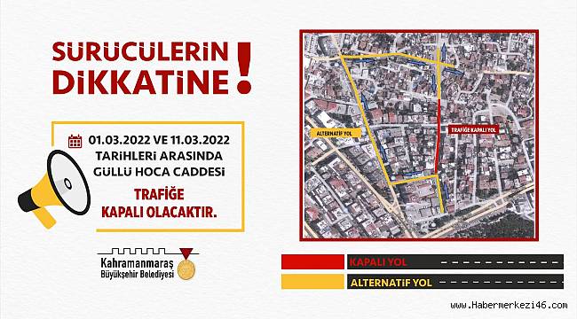 Ulaşım Hizmetleri Dairesi Başkanlığı’ndan yol kapama kararlarına ilişkin yapılan açıklamada, “Dulkadiroğlu İsa Divanlı Mahallesi’nde gerçekleştirilecek olan yol genişletme çalışmaları dolayısıyla bölgede farklı parsellerde yer alan 3 yapıda yıkım çalışmaları devam ediyor. Bu kapsamda, Güllü Hoca Caddesi’ndeki yolumuz 11 Mart tarihine kadar trafiğe kapatılmıştır. Yıkım ve hafriyat çalışmalarının tamamlanmasının ardından mevcut yol trafiğe açılacak.Onikişubat’ta Necip Fazıl Kısakürek Bulvarı’nda ise yol bakım ve onarım çalışmaları nedeniyle 15 Mart tarihine kadar trafik tek şeritten devam edecek. Vatandaşlarımızın trafikte aksaklık yaşamaması için alternatif güzergâhları kullanmaları önem arz etmektedir” ifadelerine yer verildi.
