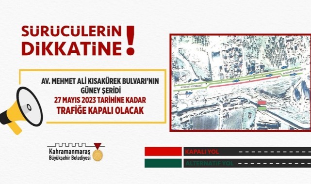 Büyükşehir Belediyesi, Avukat Mehmet Ali Kısakürek Bulvarı’nın güney şeridinin 27 Mayıs 2023 tarihine kadar trafiğe kapalı olduğunu, ulaşımın kuzey şeritten gidiş-geliş yönlü olarak sağlanacağını duyurdu.
