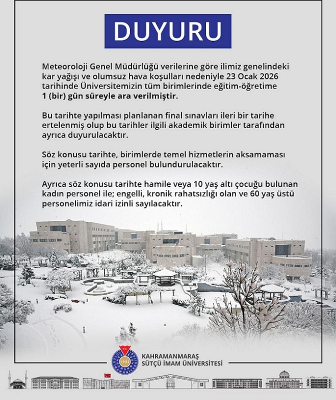 Kahramanmaraş (SHA)- Meteoroloji Genel Müdürlüğü verilerine göre Kahramanmaraş genelinde etkili olan kar yağışı ve olumsuz hava koşulları nedeniyle Kahramanmaraş Sütçü İmam Üniversitesi’nde eğitim-öğretime 23 Ocak 2026 Cuma günü 1 gün süreyle ara verildi.