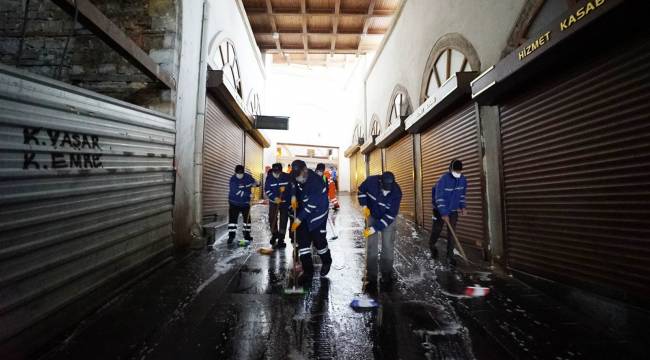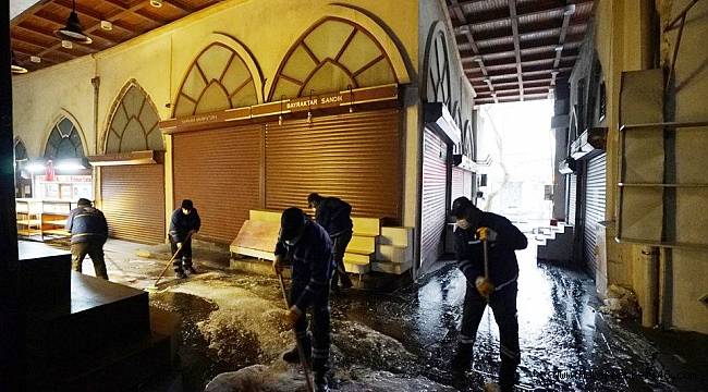 Ekipler tarihi çarşılarda olası bir salgın hastalığa meydan vermemek adına köpüklü suyla yıkama ve dezenfekte çalışmalarını tamamladılar.
