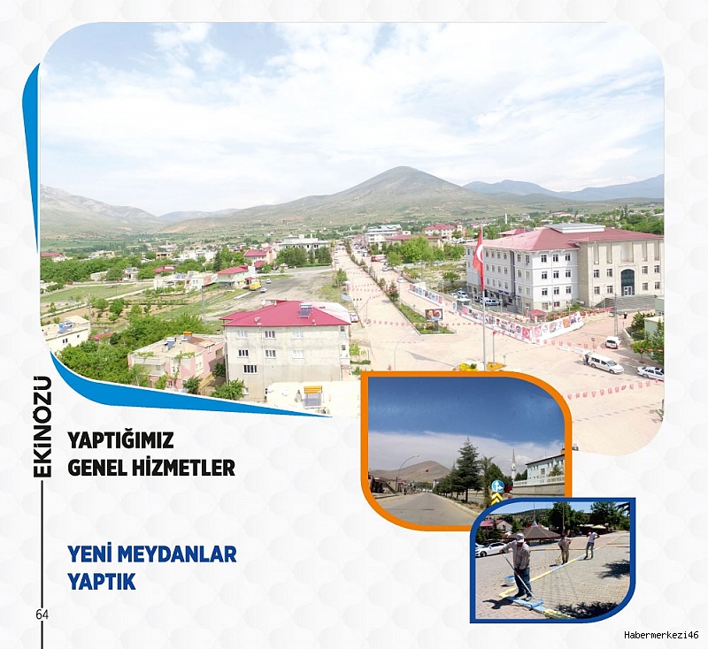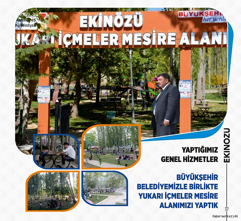35.  Hemşerilerimize yakışacak bir hizmet bilinciyle Ekinözü Mesire alanımızı hizmete açtık. 13.000 m²’lik alanda; Restoran, wc, gölet, futbol sahası, basketbol sahası, 2 adet çocuk oyun alanı, kamelya, piknik masaları, banklar, yeşil alanlar yapılarak mesire alanın içinden geçen tahliye kanalı düzenlenerek Halkımızın hizmetine açtık.