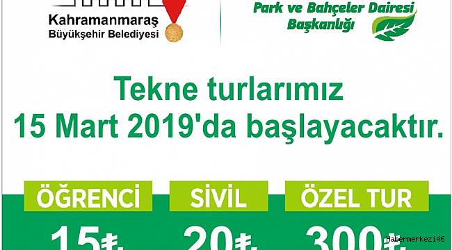 Kahramanmaraş Büyükşehir Belediyesi Park ve Bahçeler Şube Müdürlüğü bünyesinde hizmet veren tekne turlarının 15 Mart 2019 tarihinde başlayacağı ve fiyat tarifesinin de belirlendiği belirtildi.