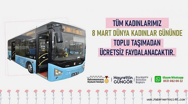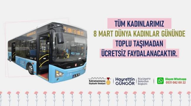 Kahramanmaraş Büyükşehir Belediyesi, 8 Mart Dünya Kadınlar Günü dolasıyla anlamlı bir kampanyaya daha imza attı. Bu kapsamda, 8 Mart Salı günü (bugün) şehir içi ulaşımda faaliyet gösteren toplu taşıma araçları kadınlara ücretsiz hizmet verecek. Gece yarısına kadar geçerli olacak uygulamayla ilgili sosyal medya hesabından açıklama yapan Başkan Güngör, “Tüm Kahramanmaraşlı kadınlarımıza hediyemiz olsun. 8 Mart Dünya Kadınlar Günü kutlu olsun” dedi.