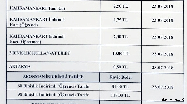 Kahramanmaraş Büyükşehir Belediyesi Ulaşım Hizmetleri Dairesi Başkanlığı’ndan yapılan yazılı açıklamada: “Toplu Taşıma Ücretlerinin güncellenmesi konusu 06.07.2018 tarih ve 2018/05-25 Sayılı Ulaşım Koordinasyon Merkezi(UKOME) gündeminde görüşülmüş olup; ‘Kahramanmaraş İl Merkezinde hizmet veren Hasılat Paylaşım Rotasyon Sistemi (HPRS) ile çalışan Özel halk Otobüslerinin, şehir merkezinde Hasılat Paylaşım Rotasyon Sistemi ile çalışan Belediye otobüslerinin ve Hasılat Paylaşım Rotasyon Sistemi harici çalışan özel halk otobüslerinin ve belediye otobüslerinin toplu taşıma Ücretleri yeniden belirlenmiş ve yolcu taşıma tarifeleri 23.07.2018 tarihinden itibaren geçerli olmak üzere Kahramanmaraş il merkezinde yolcu taşımacılığı yapmalarına oybirliği ile karar verilmiştir” denilerek bilgi verildi.