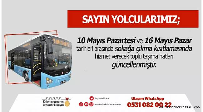 Ulaşım Hizmetleri Dairesi Başkanlığı’ndan kısıtlılık süresince çalışan sefer saatlerine https://kahramanmaras.bel.tr/toplu-tasima-guzergah-ve-saatleri adresinden ulaşılabileceği veya 0531 082 00 22 numaralı “Ulaşım Whatsapp” hattı üzerinden bilgi alınabileceği ifade edildi.