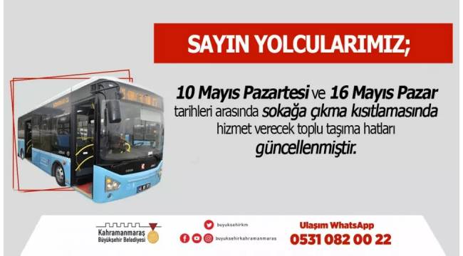 Kahramanmaraş Büyükşehir Belediyesi tarafından 10 – 16 Mayıs tarihleri arasında sokağa çıkma kısıtlılığı nedeniyle toplu taşıma sefer sayı ve saatlerinde güncelleme yapıldı.