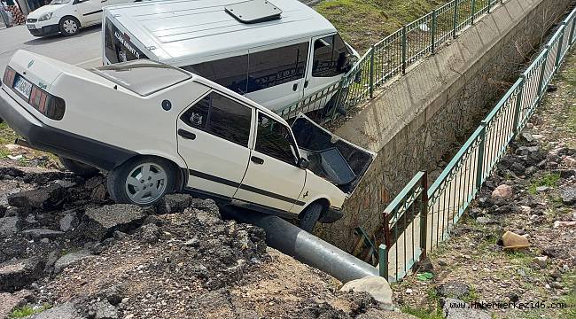 Trafik kazası sonrası otomobil su kanalı üzerinde askıda kaldı