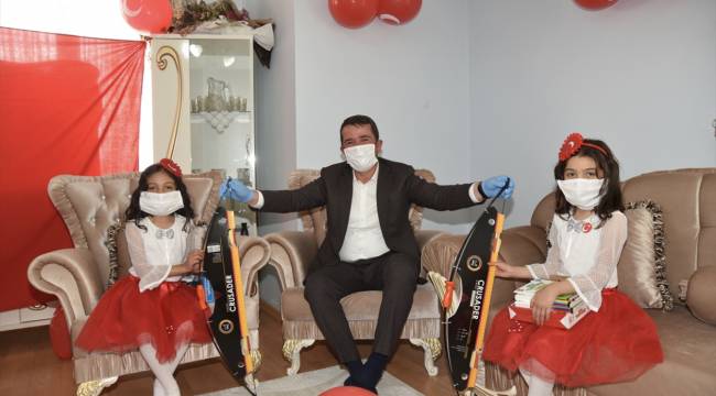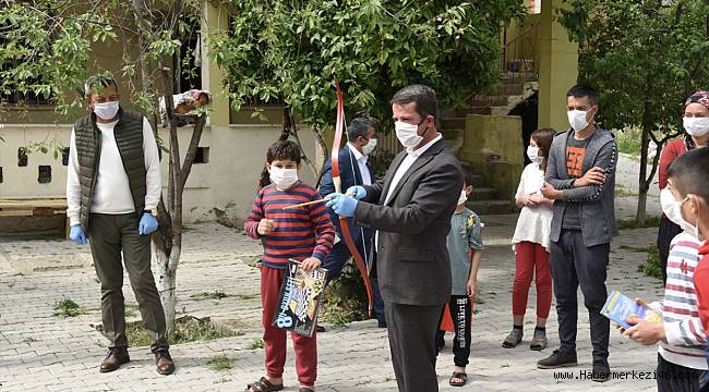 Okumuş, ziyaretti ettiği evlerde çocukları, 23 Nisan şiirleri okuyan öğrencilere bayrak, ok, yay, okuma seti, oyun setleri gibi çeşitli hediyelerle ödüllendirdi.
