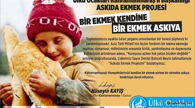 Milletimizin her türlü zorluğun üstesinden birlik ve beraberlik sayesinde geldiğini ifade eden Ülkü Ocakları Kahramanmaraş İl Başkanı Hüseyin Kayış: "Milletimizin arasında birlik, yardımlaşma ve dayanışma kültürünün artırılması adına, “Komşusu açken tok yatan bizden değildir” anlayışı doğrultusunda, Liderimiz Sayın Devlet Bahçeli Bey’in talimatlarıyla “Askıda Ekmek Projesini” başlatmış bulunmaktayız. Kahramanmaraşlı hemşehrilerimizi kendine bir ekmek alırken bir ekmekte askıya bırakmaya davet ediyoruz." Dedi.