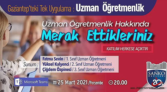 SANKO Okulları 1’inci sınıf Uzman Öğretmeni Fatma Sevin, 2’nci sınıf Uzman Öğretmeni Yüksel Kalyenci ve 3’üncü sınıf Uzman Öğretmeni Çiğdem Özpineci’nin katılımlarıyla düzenlenen “Uzman Öğretmenlik Hakkında Merak Ettikleriniz” konulu online söyleşide ülkemizde birçok seçkin okulda ve eğitimde önde gelen birçok ülkede uygulanan uzman öğretmenlik sisteminin, öğretmenler ve öğrenciler açısından avantajları anlatıldı.