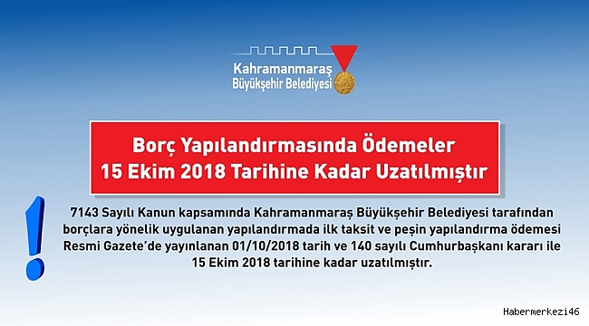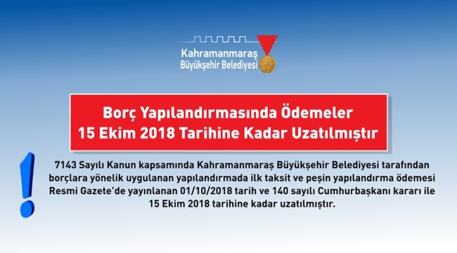 Konu ile ilgili olarak Kahramanmaraş Büyükşehir Belediyesi Mali Hizmetler Dairesi Başkanlığı’ndan yapılan açıklamada: “7143 sayılı Kanun kapsamında Kahramanmaraş Büyükşehir Belediyesi tarafından borçlara yönelik uygulanan yapılandırmada ilk taksit ve peşin yapılandırma ödemesi Resmi Gazetede yayınlanan 1 Ekim 2018 tarih ve 140 sayılı Cumhurbaşkanı kararı ile 15 Ekim 2018 tarihine kadar uzatılmıştır. Tüm vatandaşlarımıza duyurulur”denilerek bilgi verildi.