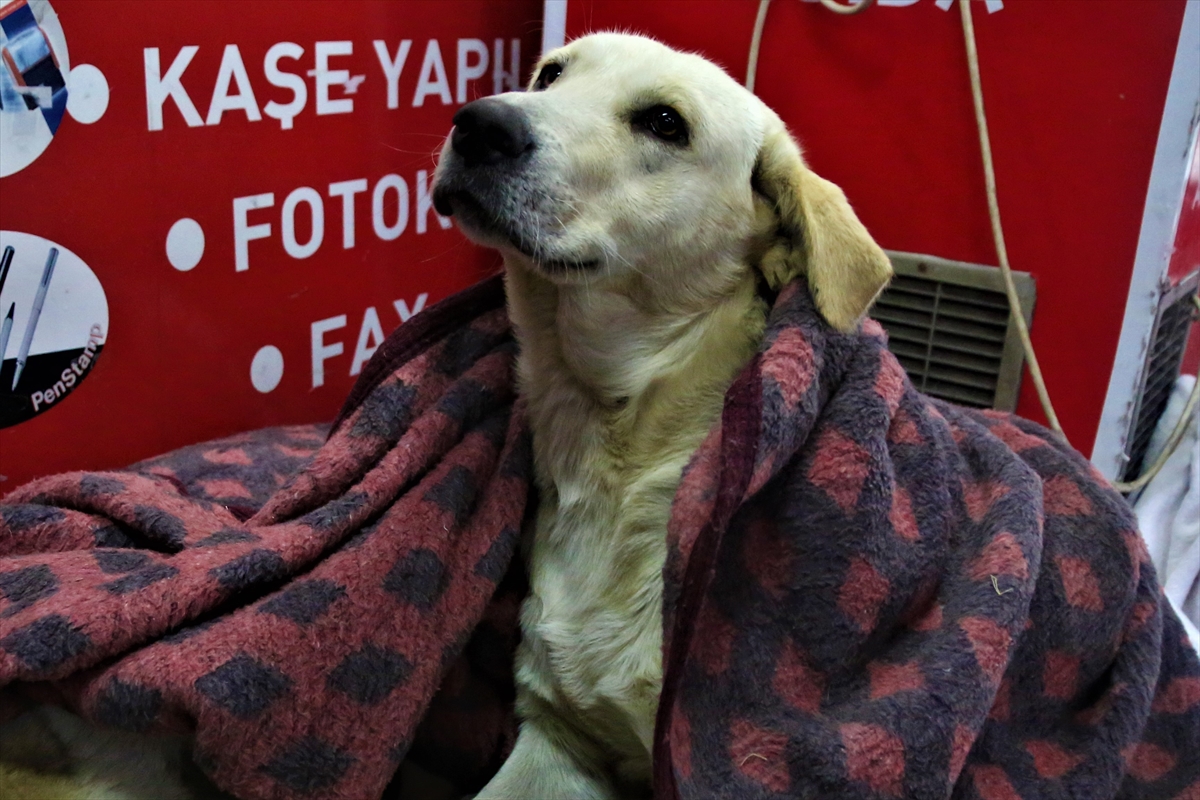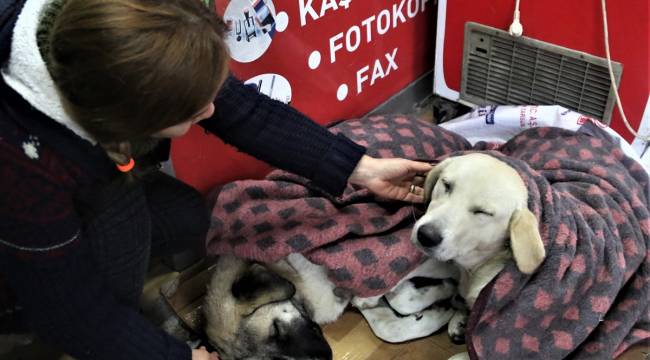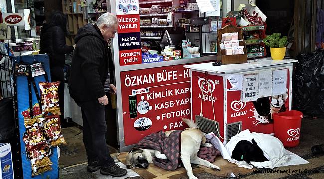 (AA) - Mersin'de büfe işleten Osman ve Ayşe Koç çifti, yağmur ve soğuktan etkilenen üç köpeği battaniyeyle ısıtarak mama verdi.